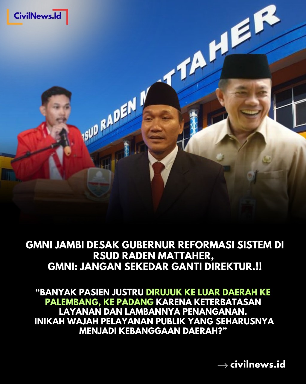 Jambi, 8 November 2025. Gerakan Mahasiswa Nasional Indonesia (GMNI) Cabang Jambi menyoroti persoalan serius dalam pelayanan kesehatan di RSUD Raden Mattaher. GMNI menilai, pencopotan direktur utama rumah sakit tersebut oleh Gubernur Jambi tidak akan membawa perubahan signifikan jika tidak diikuti dengan reformasi sistemik dalam tata kelola pelayanan publik.