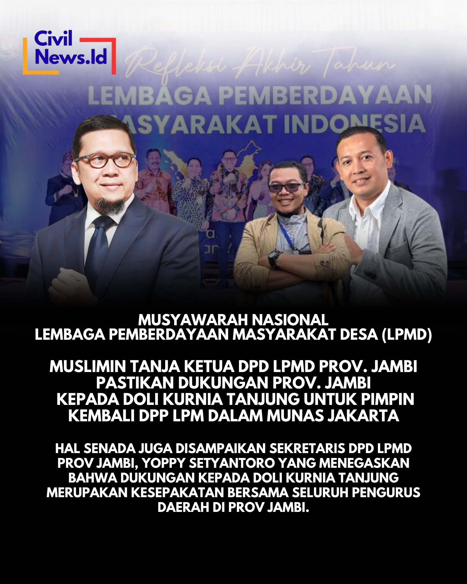 Jambi, Ketua Dewan Pimpinan Daerah Lembaga Pemberdayaan Masyarakat (DPD LPM) Provinsi Jambi, Muslimin Tanja, menyatakan dukungan penuh kepada Doli Kurnia Tanjung untuk memimpin Dewan Pimpinan Pusat LPM periode 2026–2031.