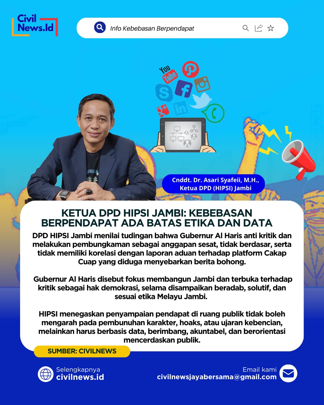 DPD HIMPUNAN INSAN PERS SOLIDARITAS INDONESIA ( HIPSI ) JAMBI, menyayangkan atas pendapat dari seseorang yang mengklaim dirinya aktivis dalam tulisan disebuah media online yang menuding Gubernur Jambi Dr. H. Al Haris. S. Sos. M.H, anti kritik dan menuduh ada upaya pembungkaman pasca adanya dilik aduan Ritas Mariyanto ke Polda Jambi oleh Platform Cakap Cuap yang patut diduga menyebarkan berita bohong.