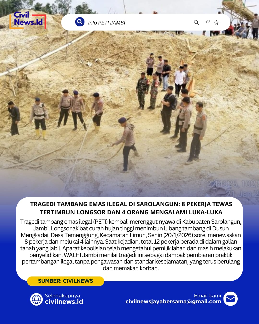 Civilnews.id, Sarolangun Jambi – Sebuah tragedi memilukan terjadi di lokasi pertambangan emas tanpa izin (PETI) di Dusun Mengkadai, Desa Temenggung, Kecamatan Limun, Kabupaten Sarolangun, pada Senin (20/1/2026) sore, yang menewaskan 8 pekerja dan 4 orang mengalami luka-luka.