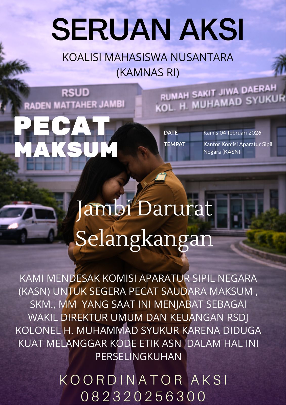 Koordinator Lapangan KAMNAS, Moh Zuhri Akbar, mengatakan bahwa aksi ini membawa sejumlah tuntutan kepada KASN. Salah satunya mendesak KASN agar mengevaluasi dan mencopot Maksum, SKM., MM dari jabatannya sebagai Wakil Direktur Umum dan Keuangan RSUD Kolonel Abundjani. Menurut KAMNAS, terdapat dugaan pelanggaran kode etik ASN serta dugaan penyalahgunaan wewenang yang dilakukan oleh pejabat bersangkutan.