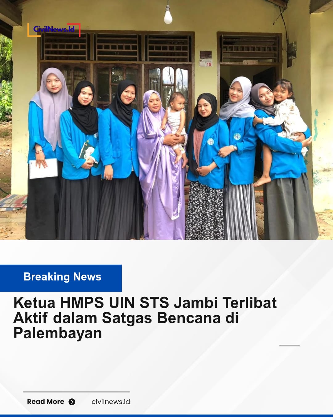 Siti Raudatul Jannah, Ketua HMPS UIN Sulthan Thaha Saifuddin Jambi, turut menjadi relawan dalam Satgas Bencana UIN STS Jambi untuk membantu pemulihan warga.