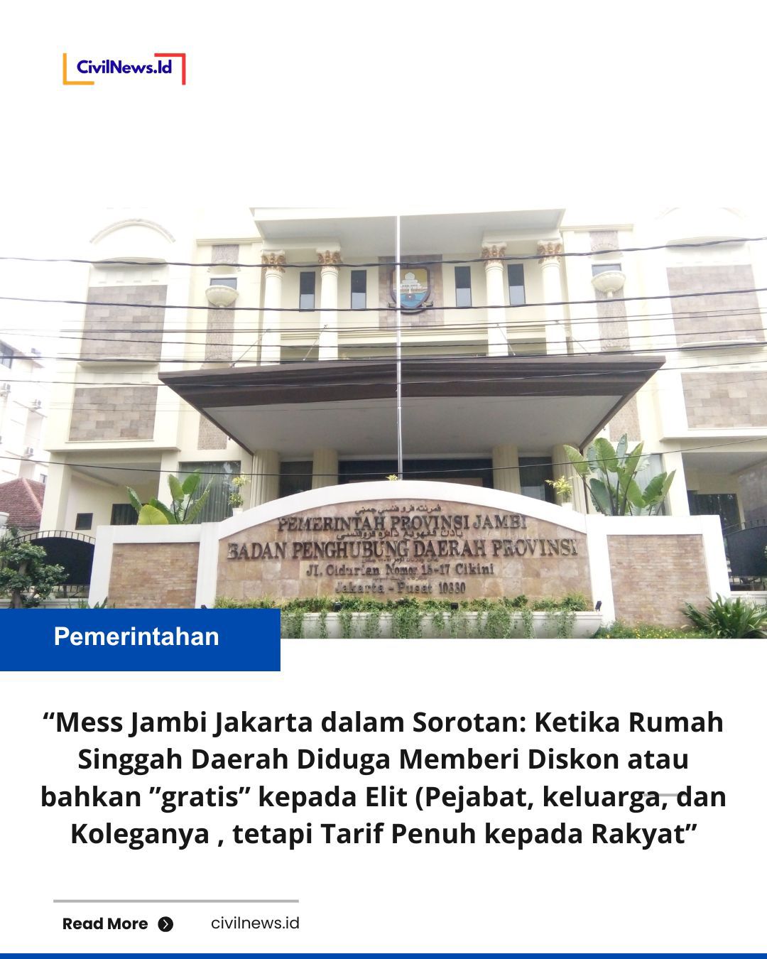 Ada sebuah bangunan di Jakarta yang seharusnya menjadi “rumah singgah” bagi orang Jambi. Tempat itu adalah Mess Jambi, penginapan milik Badan Penghubung Provinsi Jambi yang berada di kawasan Cikini, Menteng, Jakarta Pusat. Lokasinya strategis dekat pusat pemerintahan, rumah sakit besar, hingga stasiun kereta sehingga memang disiapkan untuk membantu masyarakat Jambi yang sedang memiliki urusan di ibu kota. (Badan Penghubung Jambi)